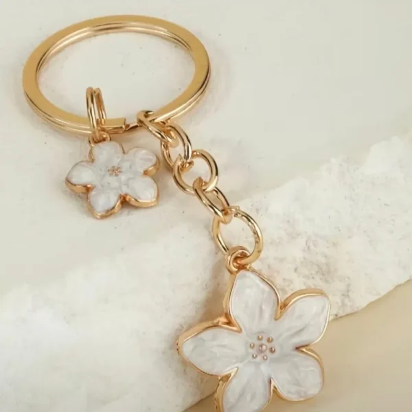 Add a delicate floral touch to your everyday accessories with this beautiful flower key ring charm. Designed with a glossy white flower pendant and gold-tone metal finish, this keychain brings a stylish and elegant look to your keys, bags, or backpacks.