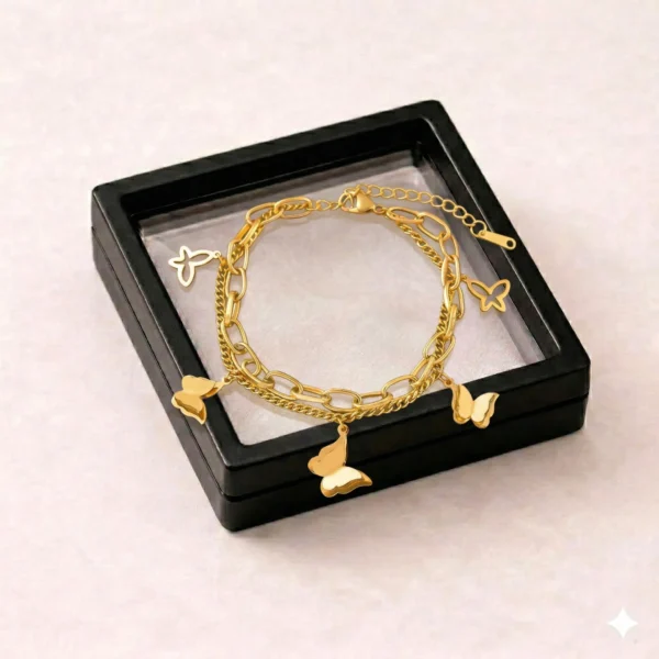 Add a delicate and feminine touch to your jewellery collection with this elegant gold butterfly double bracelet. Designed with a layered chain style and a charming butterfly detail, this bracelet brings a graceful and trendy look to any outfit.